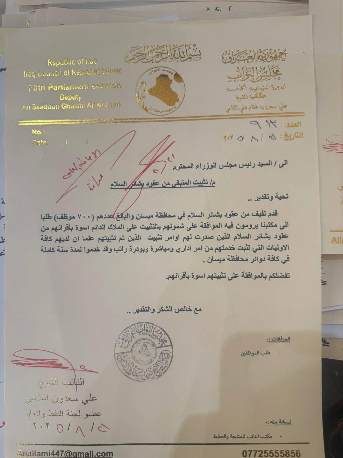 قال ” النائب علي سعدون اللامي في تصريح له تلقا نسخه منه وكالة الوتد نيوز الدولية : انه استحصل موافقة رئيس مجلس الوزراء على إدراج تثبيت العقود التالية على الملاك الدائم ضمن موازنة عام ٢٠٢٦ ، اسوة بأقرانهم من الذين تم تثبيتهم ، وذلك بناءا” على الكتب والمخاطبات الرسمية المقدمة الى رئيس مجلس الوزراء محمد شياع السوداني .